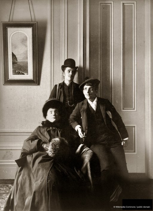 Zwei Frauen in Männerkleidung und ein Mann in Frauenkleidung (um 1890)